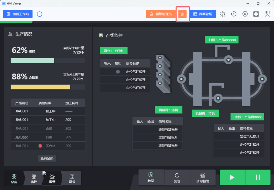 低代码人机交互组态软件HMI应用发布和使用用户登录和管理本页总览用户登录和管理HMI浏览器集成用户登录与分级权限管理功能,通过预设操作权限等级实现工业应用的安全管控,同时简化权限配置流程。 用户管理 使用 超级管理员 登录后,工具栏中会出现 用户管理 按钮,点击后可以进行用户管理。 点击 添加用户 输入 用户名、用户等级和密码,点击 确定 即可完成用户创建和编辑。