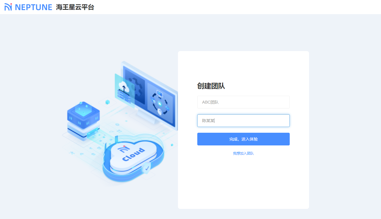 - 选择创建新团队,输入您的团队名称及姓名,点击创建